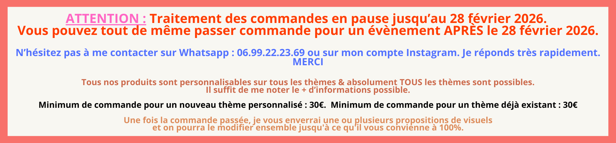 Minimum de commande pour un nouveau thème personnalisé : 30€. Minimum de commande pour un thème déjà existant : 30€